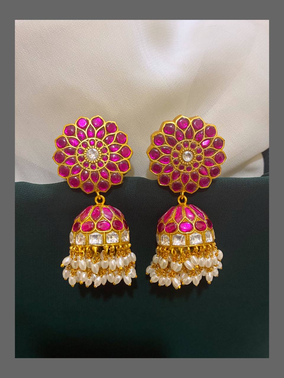Featuring elegant jadau flower design and a convenient back screw, these Jhumkis are a must-have for any special occasion. Handcrafted to perfection, they add a touch of traditional charm to any outfit. Expertly crafted and designed, these earrings are a true statement piece.