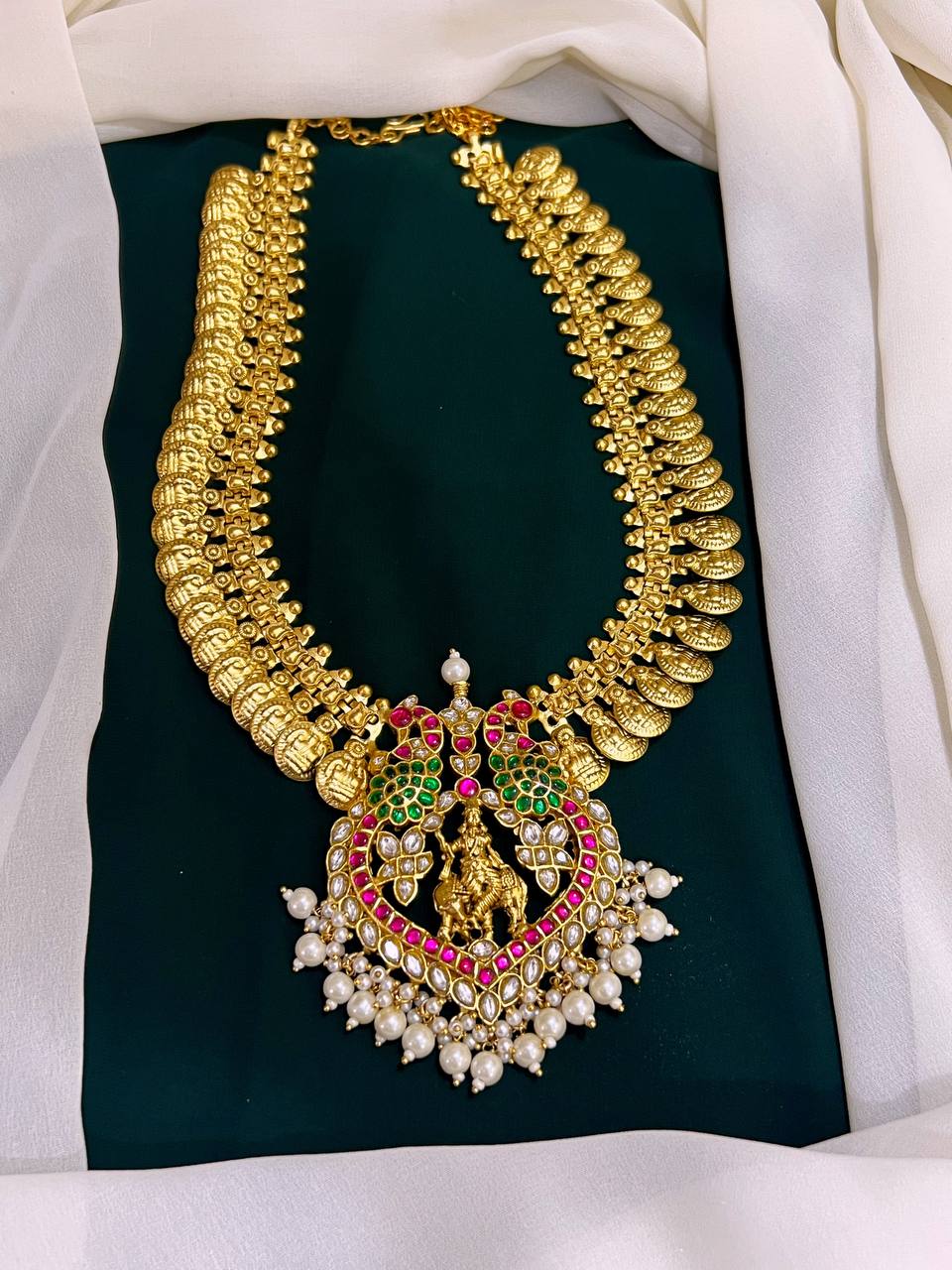 Traditional temple collection Kasu long Haram with Krishna pendant and rice water pearls