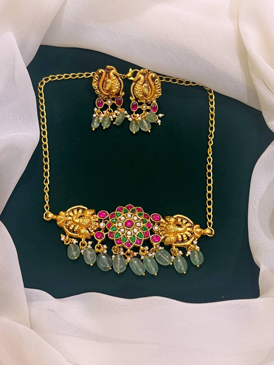 Elevate your accessory collection with this exquisite Jadau Kundan in Flower Necklace with Earrings adorned with intricate JADAV KUNDAN workmanship. This stunning piece combines elegance and tradition, making it a perfect addition to any outfit, whether for a special occasion or everyday wear.