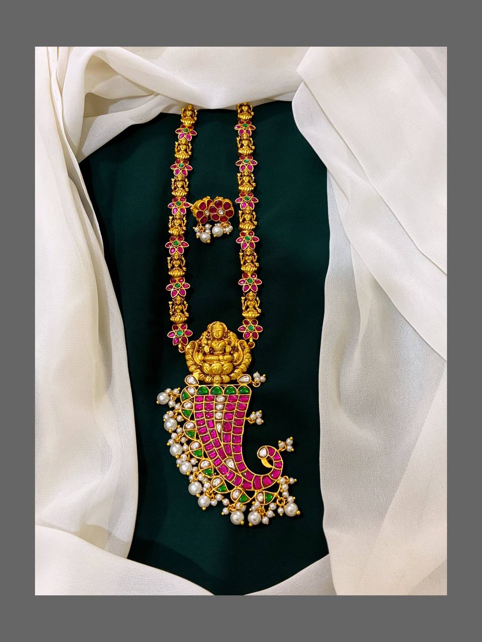 This stunning pendant features a Jadau Lakshmi design crafted from Tiger Nail and adorned with lustrous Pearls. Expertly crafted and exuding traditional elegance, this piece is perfect for adding a touch of culture and sophistication to any outfit. A must-have for any jewelry collection.