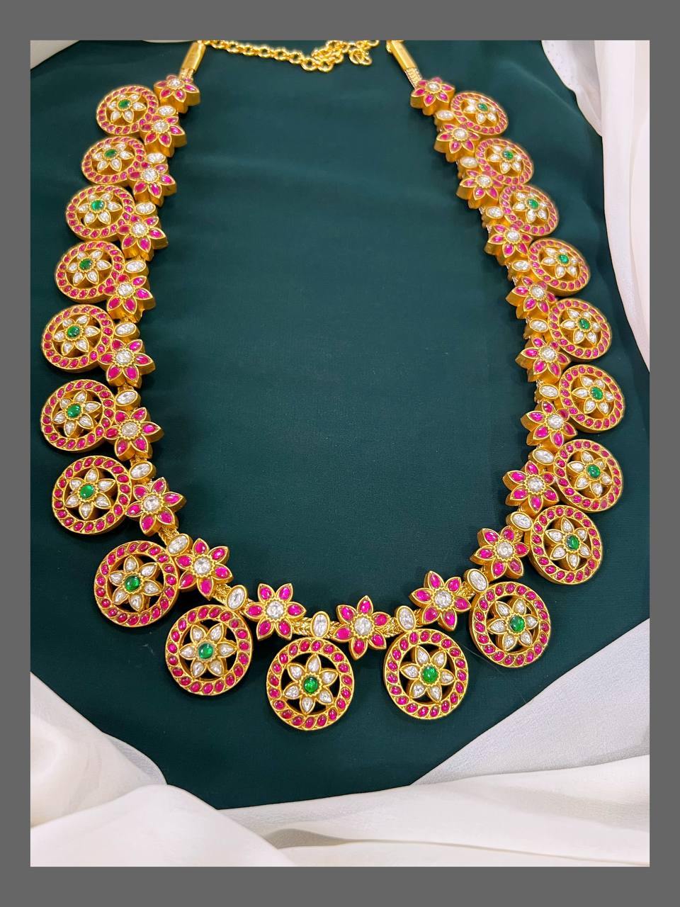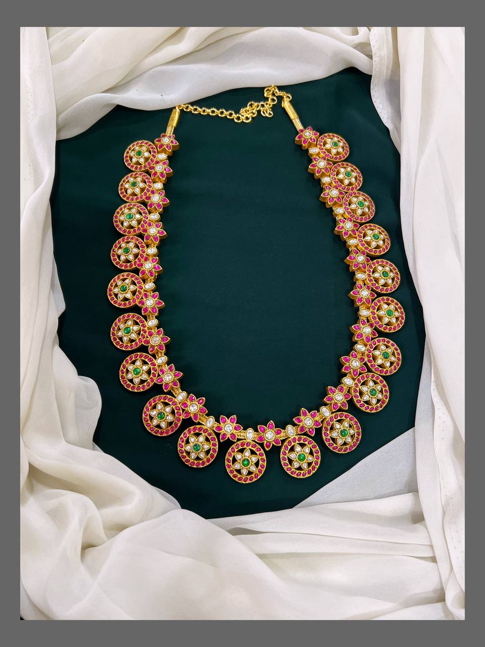 Elevate your traditional attire with our exquisite Jadau Long Bottu Haram. This stunning piece features intricate Jadau craftsmanship with beautiful bottu (pendant) detailing that draws from centuries of Indian jewelry artistry. Perfect for weddings, festivals, and special occasions, this haram adds a touch of royal elegance to your ensemble while honoring cultural heritage. Each piece is crafted with attention to detail, ensuring you feel confident and radiant.