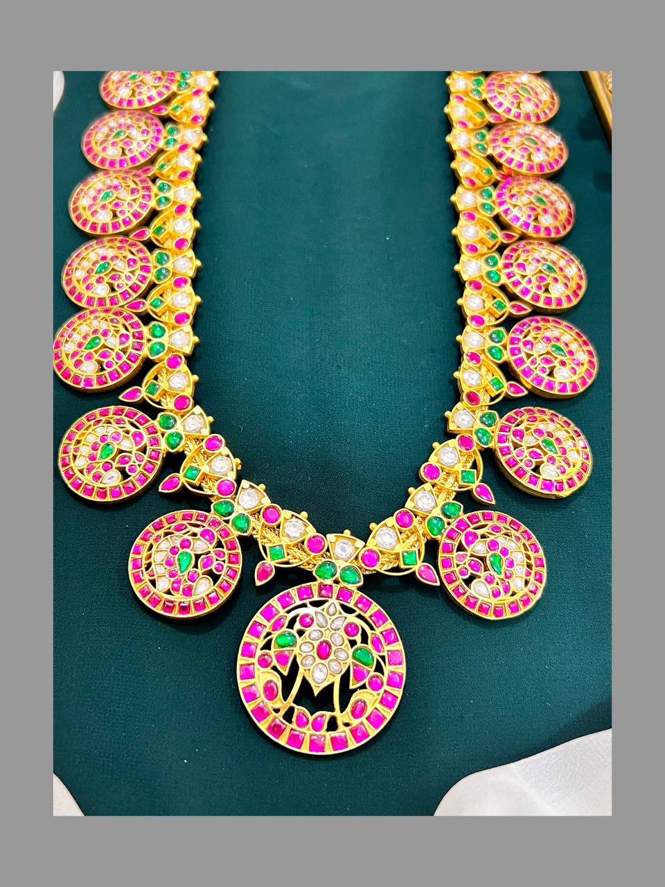 Expertly crafted in gold, this Jadau Long Bottumala Gold Replica - KH00136 showcases traditional Indian design and exquisite workmanship. Perfect for formal occasions, this statement piece will elevate any outfit with its intricate details and elegant style. Invest in a timeless piece that will add a touch of luxury to your wardrobe.