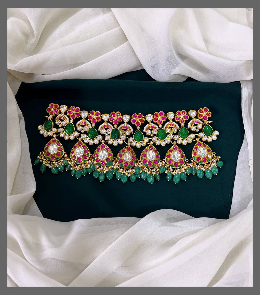 Embrace timeless elegance with our Jadau Choker With Down Drops. This exquisite piece features traditional Jadau craftsmanship with delicate drops that create a cascading effect, perfect for adding a touch of royal splendor to your special occasions. Each choker is meticulously handcrafted to ensure exceptional quality and authentic charm.
