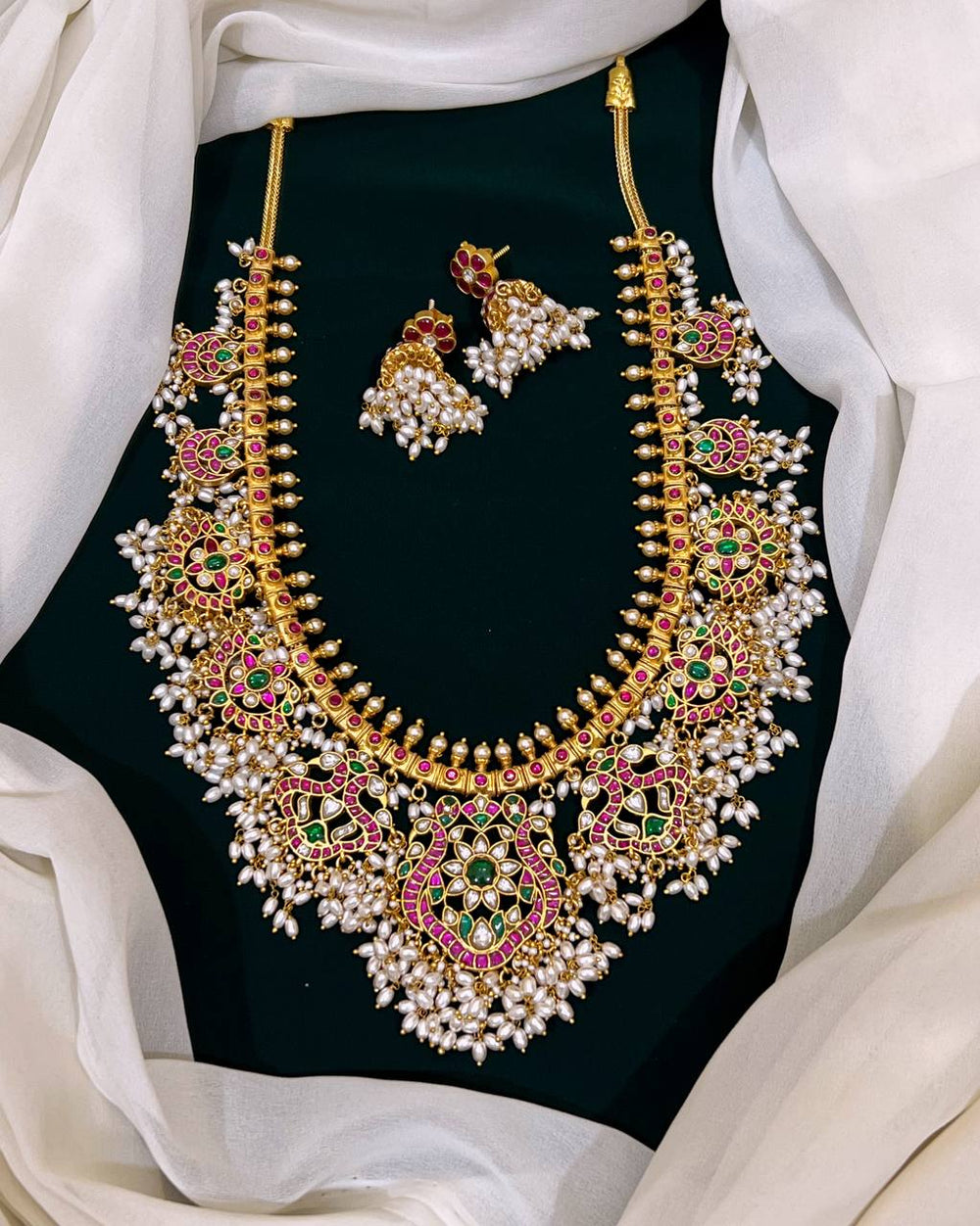 Elevate your accessory collection with this exquisite Jadau Guttipusalu Haram with Rice Water pearls Jadau Kundan Haram adorned with intricate JADAV KUNDAN workmanship. This stunning piece combines elegance and tradition, making it a perfect addition to any outfit, whether for a special occasion or everyday wear.
