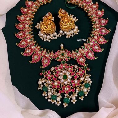 Color: Green, Pink, Ruby, Golden Yellow Style: Mango Necklace Material: Brass, Jadau, Beads Earrings: Yes Experience: Lightweight and comfortable to wear Usage: Festive season and traditional Events