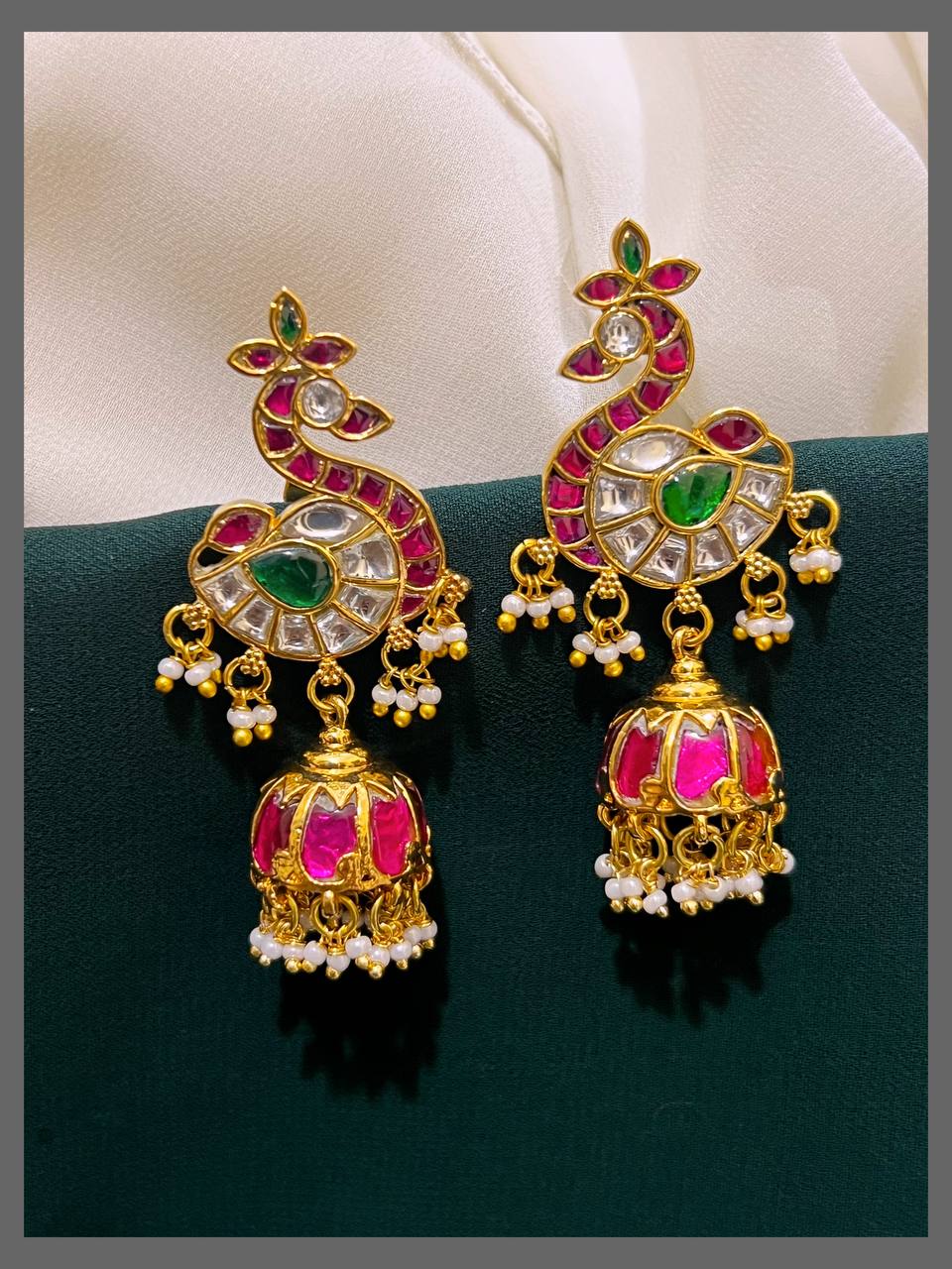 These Jadau Peacock Jhumkis with screw back offer a secure and comfortable fit, perfect for all-day wear. Featuring intricate peacock designs, they add a touch of traditional elegance to any outfit. The screw back ensures they stay firmly in place, making them ideal for special occasions or daily use. Embrace timeless beauty with these carefully crafted earrings that combine style and practicality.