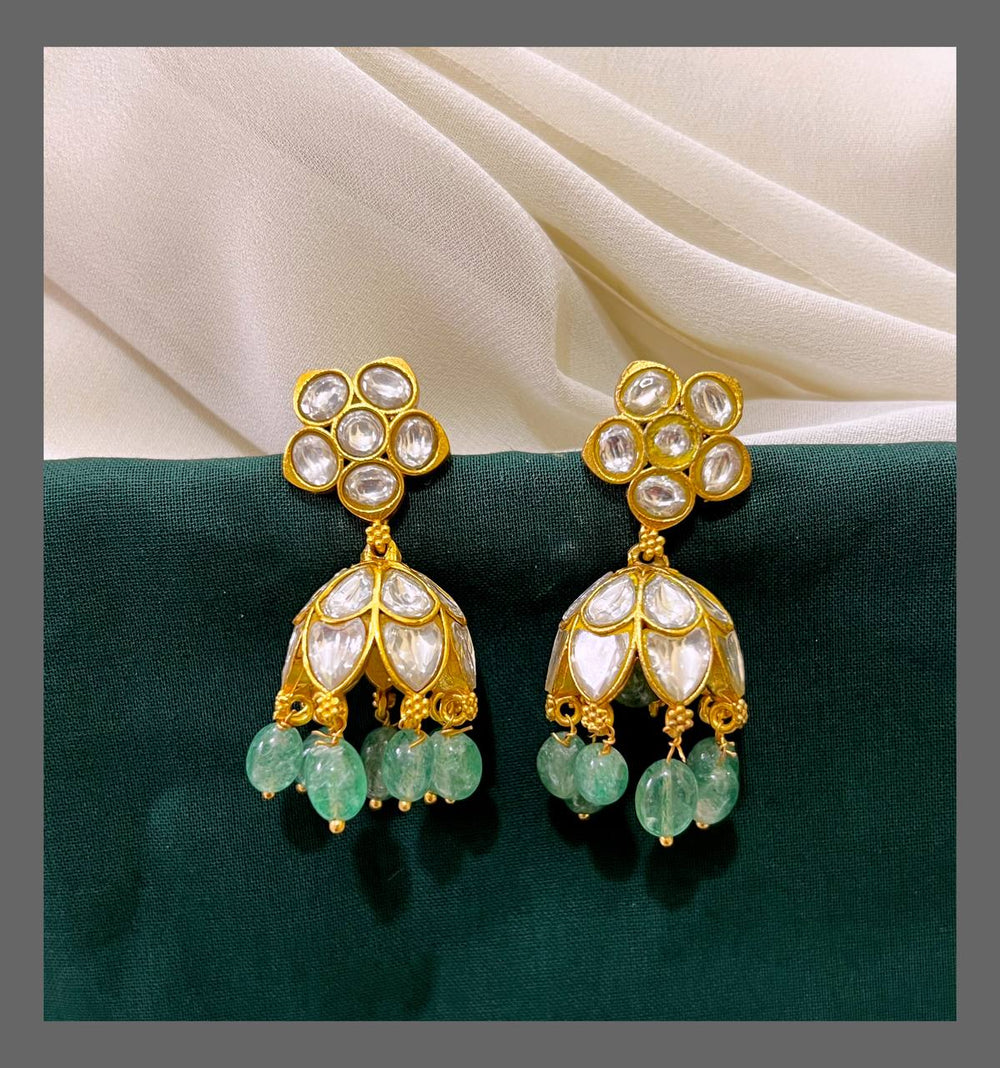 Introducing the exquisite Jadau white stone Jhumki with Screwback - KE0066. Made with the finest craftsmanship and adorned with stunning white stones, this Jhumki is a must-have accessory for any special occasion. With its convenient Screw back design, it offers both style and comfort, making it a perfect addition to your jewelry collection. Elevate your look with this elegant and timeless piece.