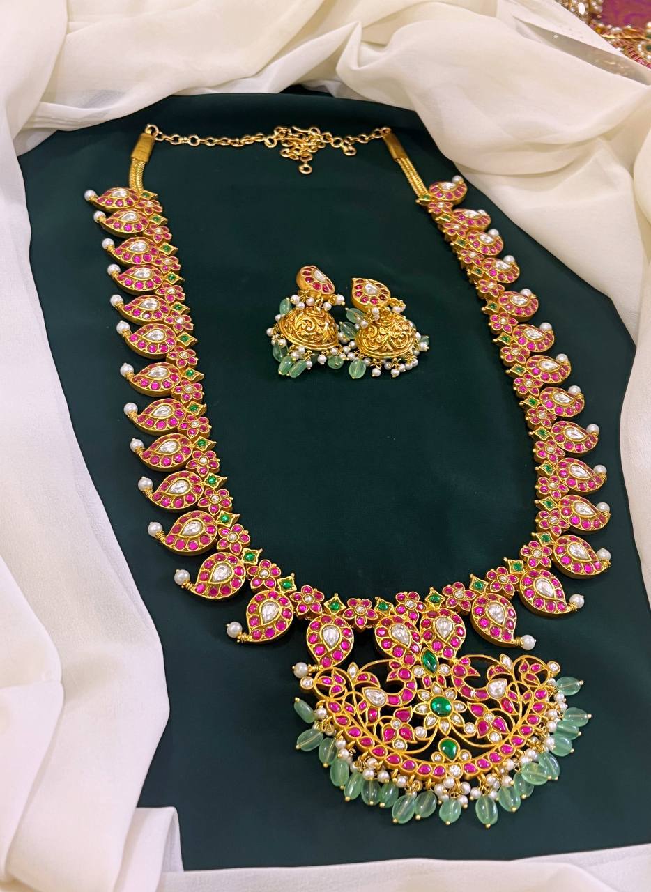 Elevate your accessory collection with this exquisite Jadav Mango Kundan Haram with Pendent and Earring adorned with intricate JADAV KUNDAN workmanship. This stunning piece combines elegance and tradition, making it a perfect addition to any outfit, whether for a special occasion or everyday wear.