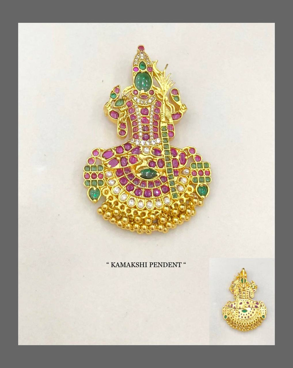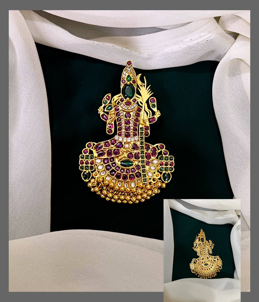 Adorn yourself with divine elegance through our Kamakshi Amman Kempu Pendant. This exquisite piece features the revered goddess crafted with meticulous attention to detail, complemented by vibrant kempu stones that symbolize prosperity and spiritual protection. A sophisticated fusion of traditional craftsmanship and timeless devotion for the discerning devotee.