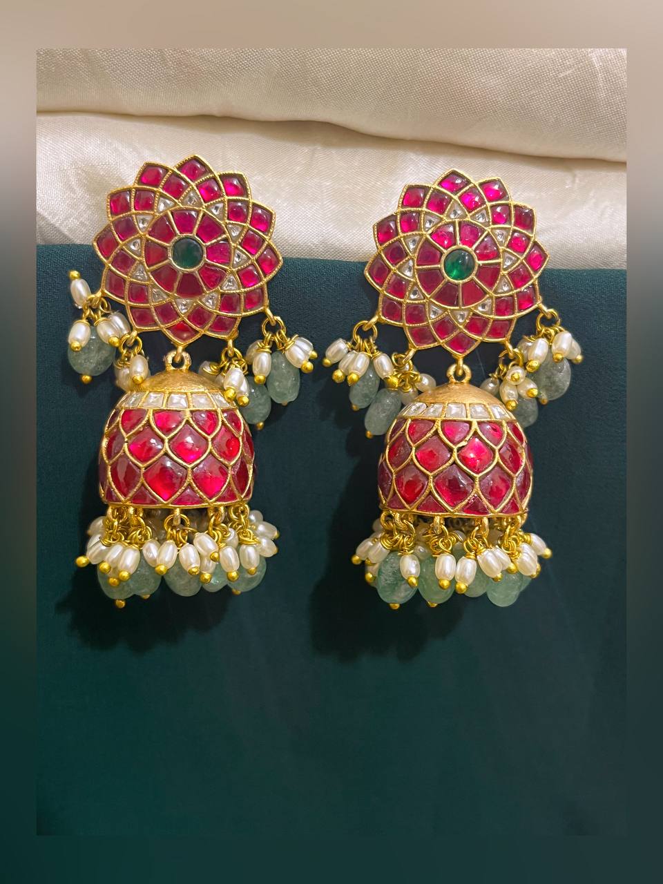 Add a touch of elegance and tradition to your jewelry collection with the jadau Flower Jimikki in Kundan. Made with high quality materials and intricate detailing, this piece is sure to make you stand out. Perfect for special occasions, this traditional Indian earring is a must-have.