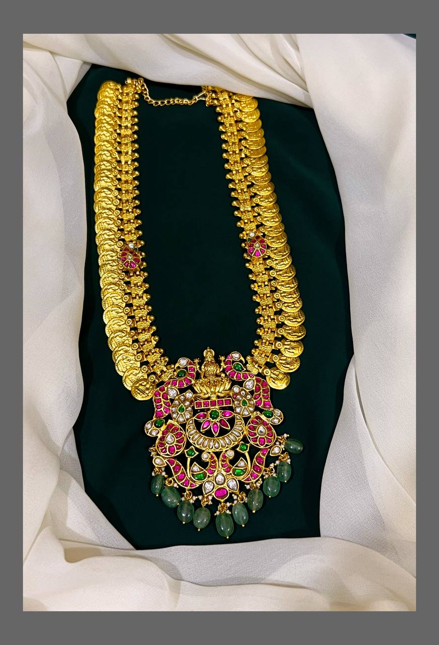 This Kashu Mala necklace features a stunning Lakshmi pendant in Kundan. With its intricate design and high-quality materials, this necklace is a true testament to the beauty of traditional Indian jewelry. Add a touch of elegance and cultural significance to any outfit with this exquisite piece.