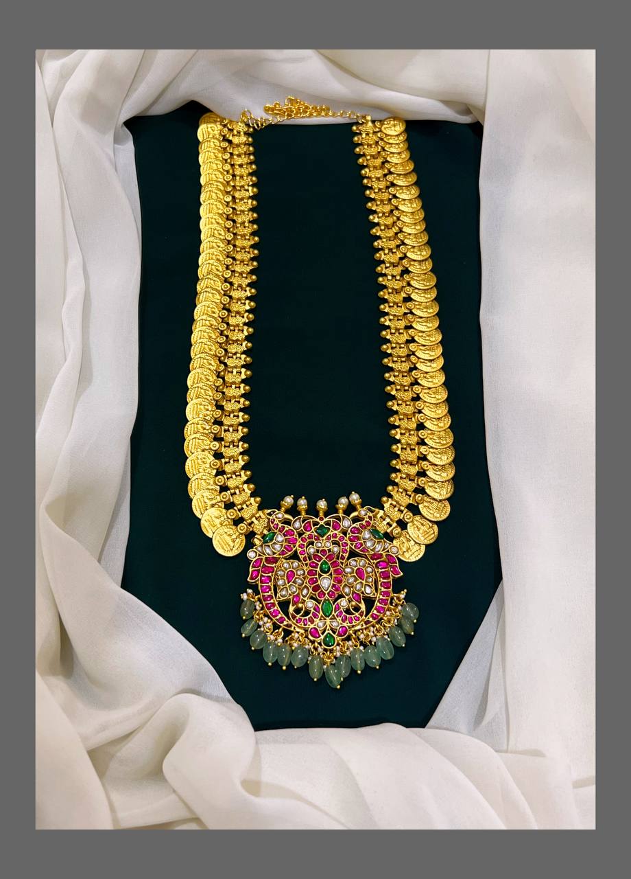 This Kashu Mala necklace features a stunning peacock pendant in Kundan Haram style. Crafted with precision and adorned with intricate details, this necklace is a must-have accessory for any special occasion. Elevate your look with this elegant piece of jewelry that exudes sophistication and luxury.