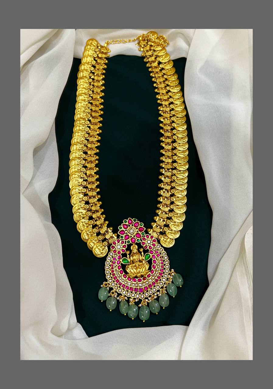 Enhance your traditional look with our Kashu mala adorned with a stunning Ruby Lakshmi pendent. Made with authentic Kundan, this Haram necklace is the perfect blend of beauty and craftsmanship. Elevate your style with the auspicious symbol of Lakshmi, the goddess of wealth and prosperity.