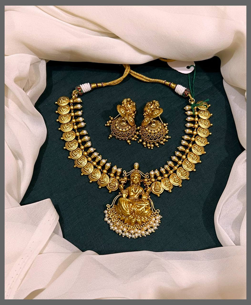 Elevate your traditional collection with this exquisite Kashu Necklace featuring a stunning Lakshmi pendant crafted in intricate Nakshi work. The delicate design celebrates the goddess of prosperity and abundance, making it a meaningful addition to your jewelry wardrobe. Perfect for festivals, celebrations, or everyday elegance, this necklace combines timeless artistry with spiritual significance. The detailed Nakshi craftsmanship showcases skilled artisan work, ensuring each piece is truly special. Wear it with confidence and grace, honoring both heritage and beauty.