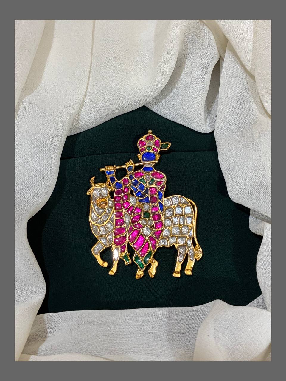 This Krishna pendent in Kundan - KP0085 features a beautiful design crafted from high-quality materials. The intricate Kundan work adds a touch of elegance, making it a perfect accessory for any occasion. Expertly made with precision and care, this pendent is a must-have for anyone who appreciates exquisite jewelry.