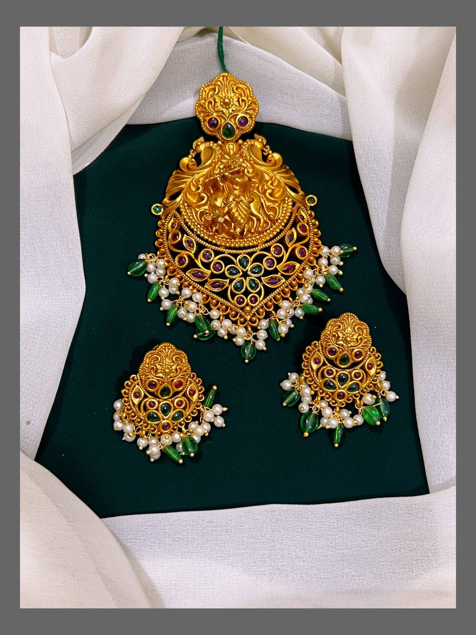 This Krishna Pendant in Nakshi design beautifully captures the divine charm of Lord Krishna with intricate craftsmanship. Its detailed artistry makes it a meaningful accessory that complements traditional and contemporary styles alike. Wearing this pendant can be a daily reminder of devotion and positivity, adding both spiritual significance and elegance to your collection.