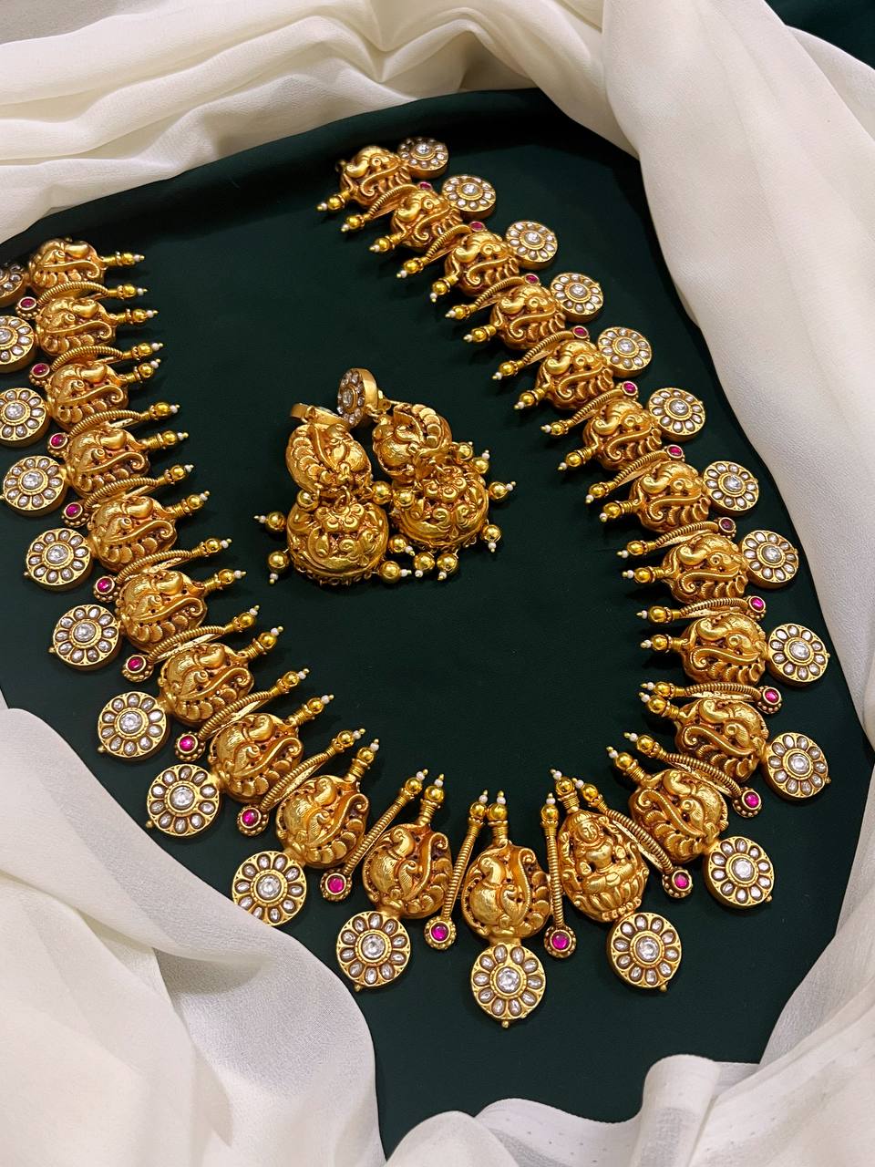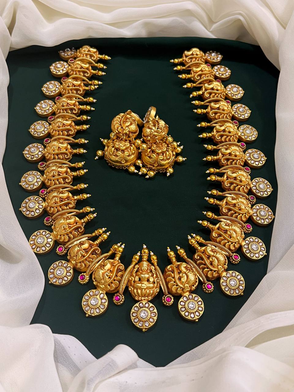 Beautiful Silver replica kundan bottu mala with Lakshmi pendant and peacock with pair of long jhumkis app 3.5-4 inches