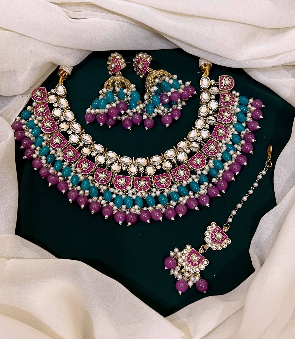 Elevate your accessory collection with this exquisite Kundan Choker Green and Purple beads for party wear with Mang tika Necklace with Earring adorned with intricate JADAV KUNDAN workmanship. This stunning piece combines elegance and tradition, making it a perfect addition to any outfit, whether for a special occasion or everyday wear.