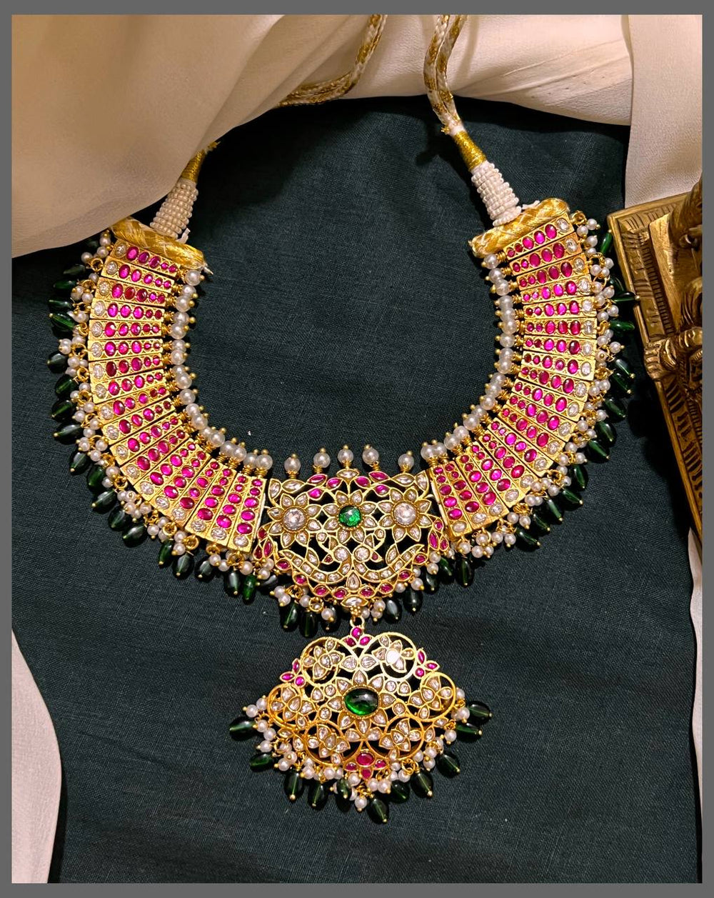Elevate your traditional wardrobe with this stunning Kundan necklace, crafted in lustrous gold polish. This exquisite piece features intricate kundan work—a time-honored jewelry technique that combines precious stones with detailed metalwork. Perfect for weddings, festivals, and special celebrations, it adds a touch of regal elegance to any ensemble. The gold polish finish ensures a radiant glow that complements both classic and contemporary styling. A timeless investment piece that brings out the best in your festive look.