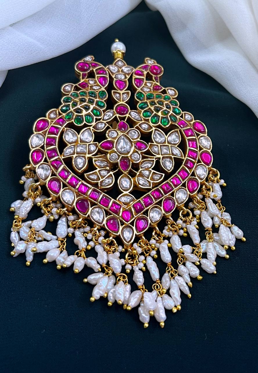 Jadau Kundan pendant with rice pearls back hook and side 2 hooks