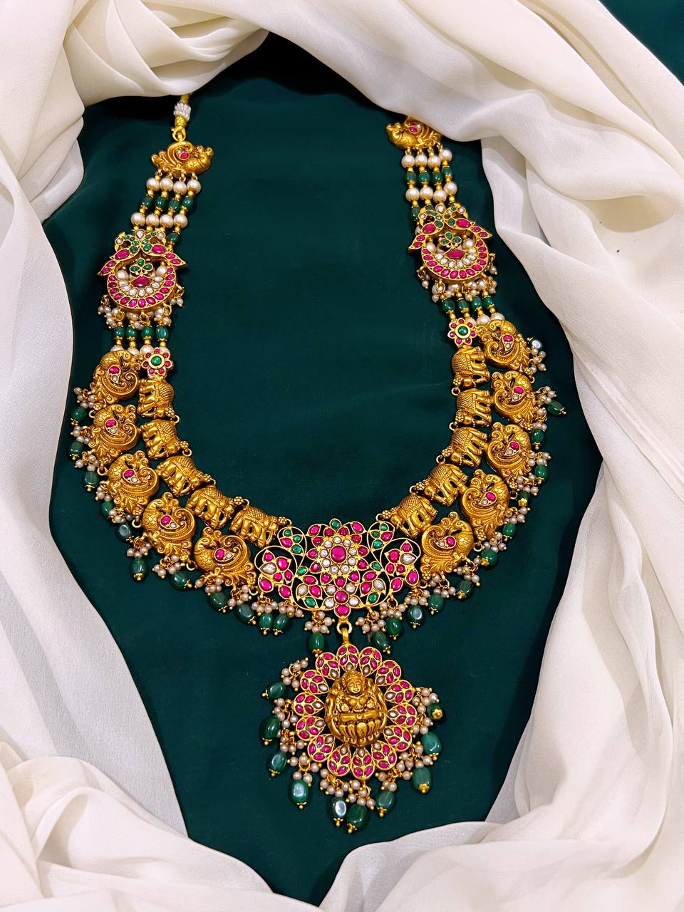 Elevate your elegance with the Lakshmi and Elephant Jadav Kundan Haram - This set features stunning Kundan and crystals, combined with luxurious pearls. Enhance your look with this timeless piece of jewelry that exudes class and sophistication. Perfect for any occasion.