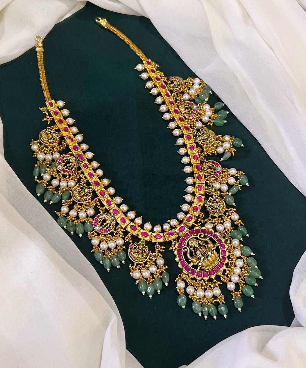 Elevate your accessory collection with this exquisite Lakshmi Haram in Jadau Kundan with Pendent adorned with intricate JADAV KUNDAN workmanship. This stunning piece combines elegance and tradition, making it a perfect addition to any outfit, whether for a special occasion or everyday wear.