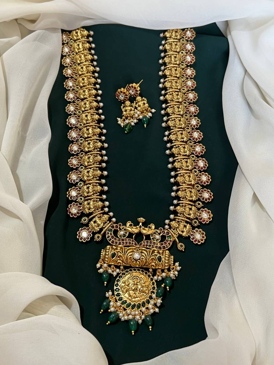Elevate your traditional attire with this exquisite Lakshmi Haram featuring an intricately designed Lakshmi pendant in beautiful Nakshi work. This timeless piece combines divine symbolism with masterful craftsmanship, making it perfect for special occasions and festivals. The detailed Nakshi work showcases the skilled artistry of traditional Indian jewelry, creating a statement piece that honors cultural heritage while adding elegance to your ensemble.