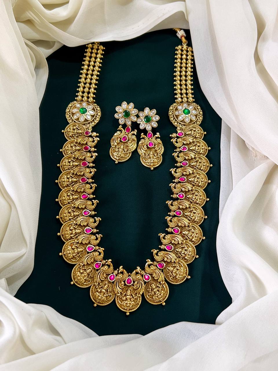 Elevate your accessory collection with this exquisite in Lakshmi Kasu in Naskhi Haram and Earring adorned with intricate NAKSHI craftsmanship. This stunning piece combines elegance and tradition, making it a perfect addition to any outfit, whether for a special occasion or everyday wear.