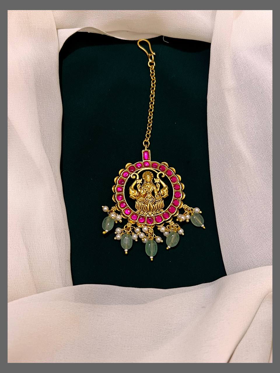 Elevate your traditional look with the Lakshmi Maang Tikka featuring a lustrous emerald pearl. This exquisite piece blends cultural elegance with rich detailing, making it perfect for festive occasions and weddings. Designed to sit comfortably and enhance your hairstyle, it adds a graceful touch that celebrates heritage and beauty.