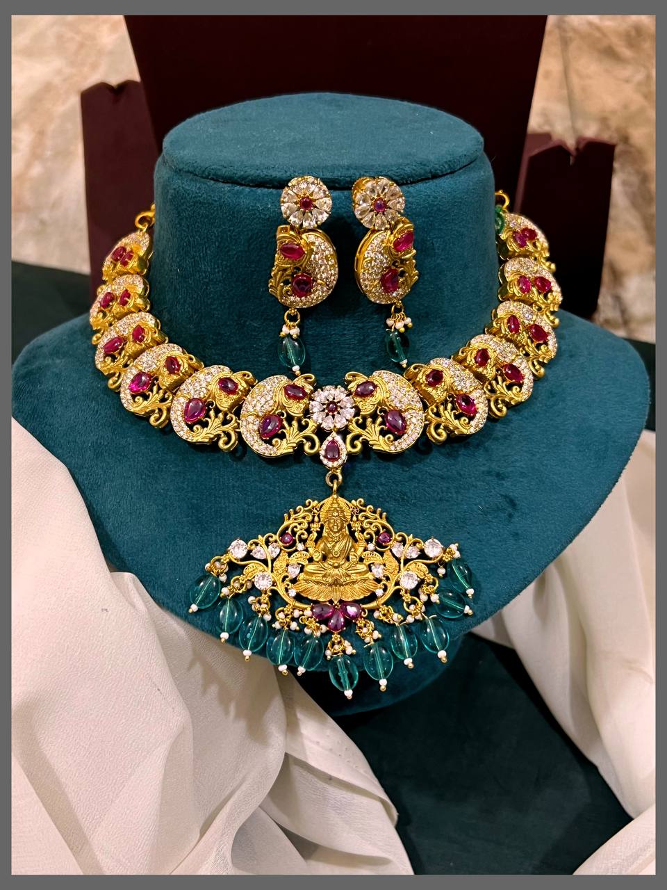 Embrace divine elegance with this exquisite Lakshmi pendant necklace, crafted in traditional Nakshi technique. The pendant features the goddess of prosperity and wealth, adorned with a lustrous white stone that catches light beautifully. This piece combines spiritual significance with timeless design, making it perfect for daily wear or special occasions. The intricate Nakshi work showcases skilled craftsmanship, while the white stone adds a touch of sophistication. Ideal for those seeking to honor their faith while wearing a stunning, versatile accessory that complements any wardrobe.