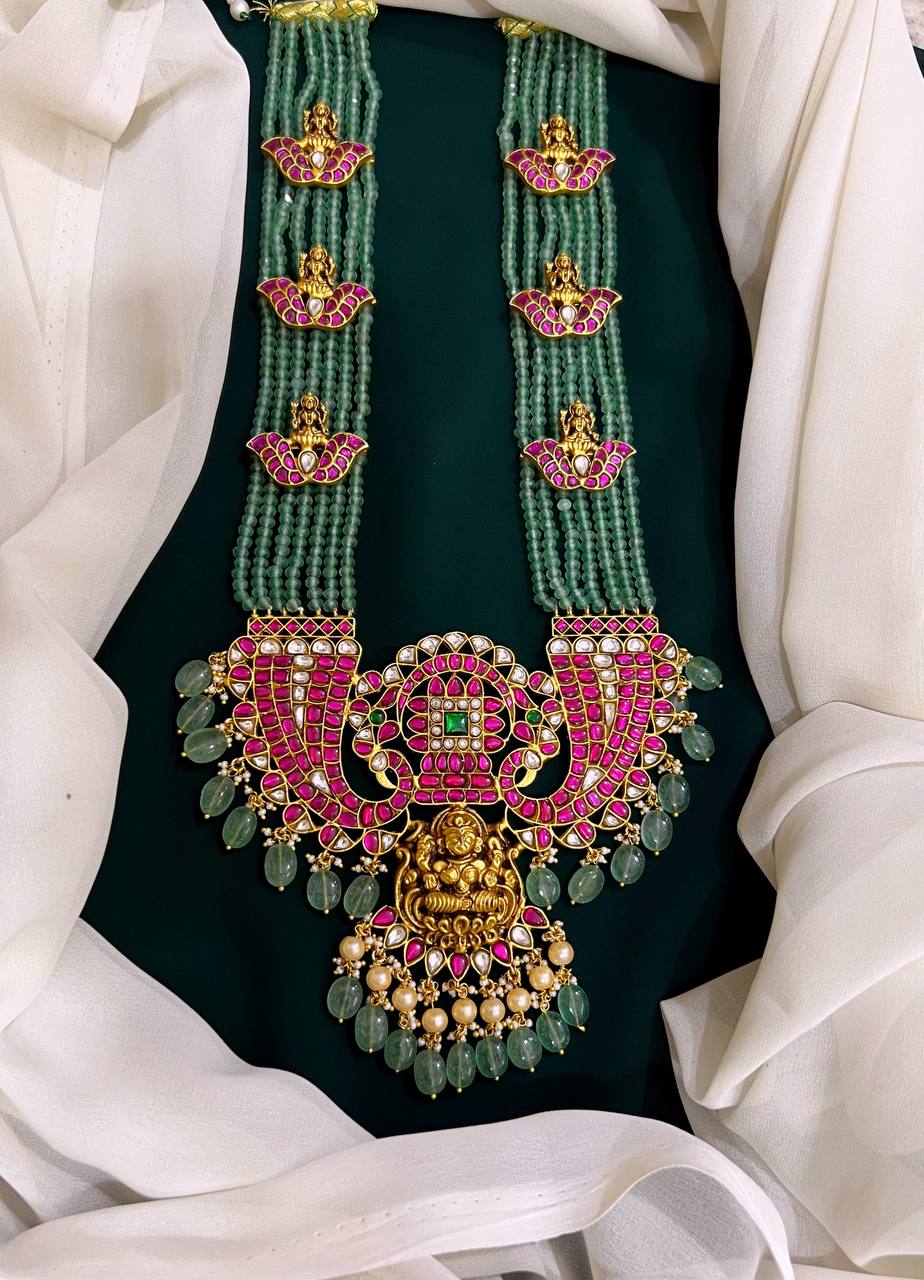 Elevate your accessory collection with this exquisite Lakshmi pendent in Jadav Kundan Haram adorned with intricate JADAV KUNDAN workmanship. This stunning piece combines elegance and tradition, making it a perfect addition to any outfit, whether for a special occasion or everyday wear.