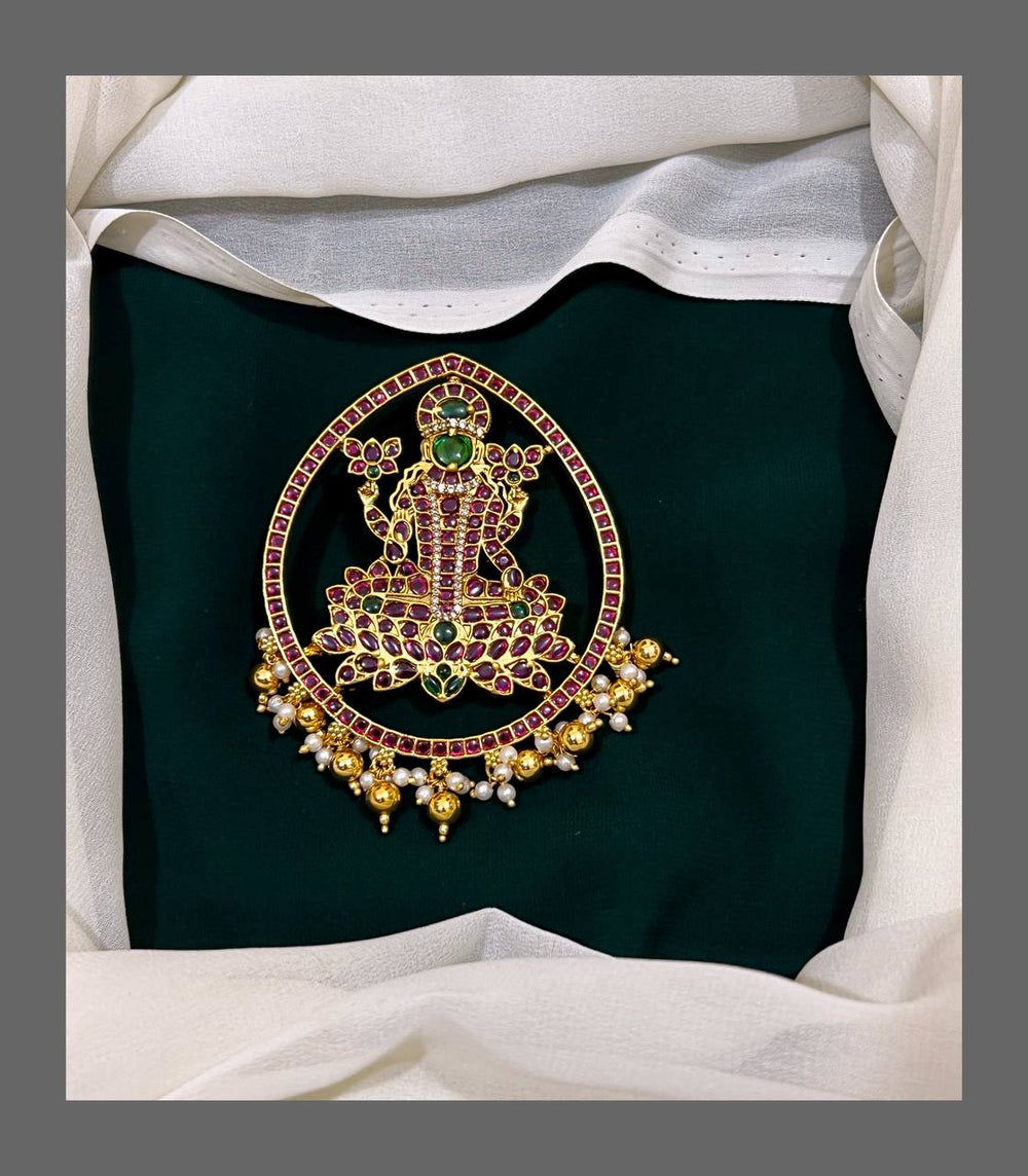 This Lakshmi Pendent in Nakshi - NP006 is a beautiful piece that showcases intricate Nakshi work. The detailing on this pendant is expertly crafted, creating a stunning and unique design. Made from high-quality materials, this pendant is sure to be a timeless addition to any jewelry collection.