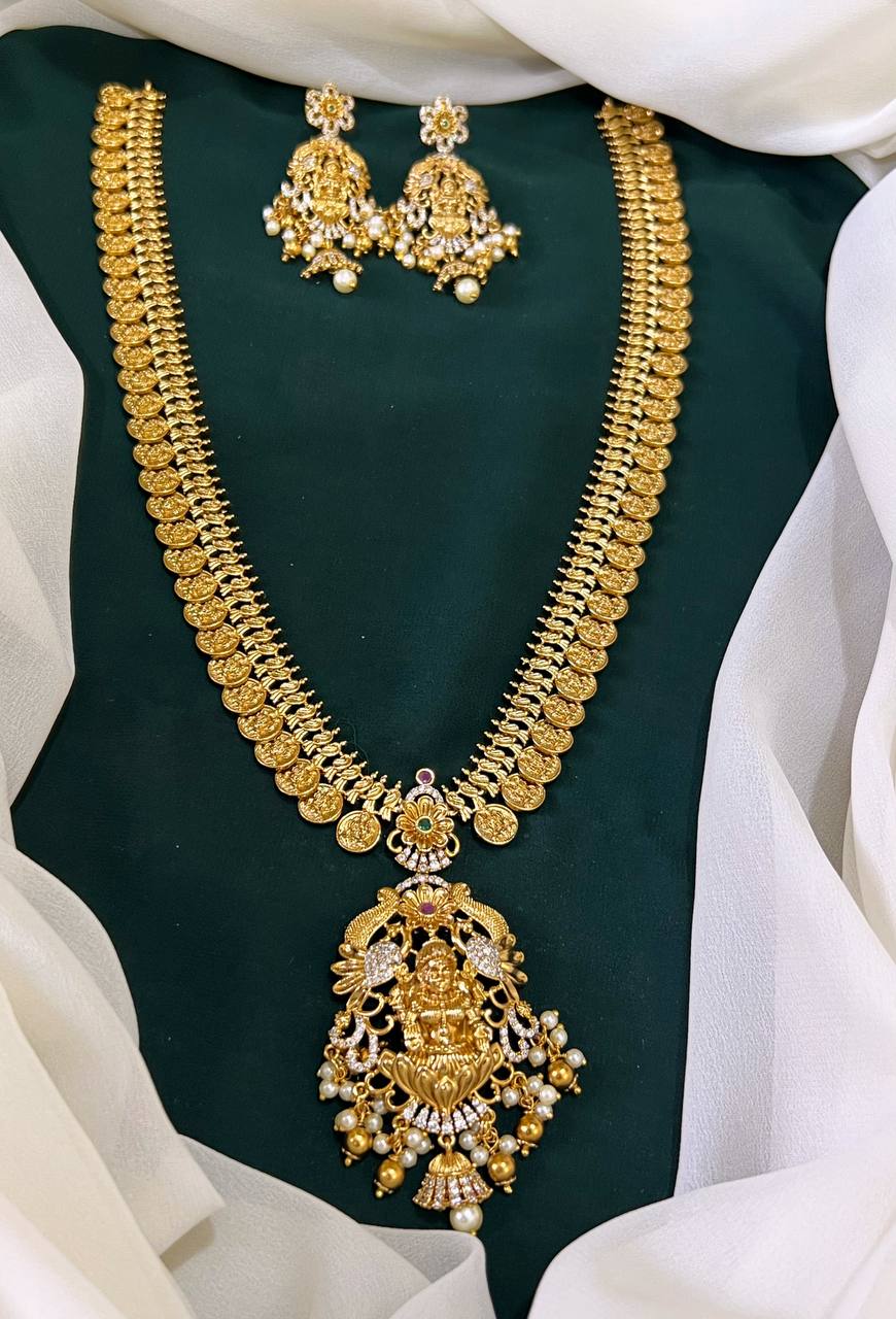 Elevate your style with the stunning Lakshmi Traditional Kaasu Haram and earrings vintage collection. Perfect for special occasions like weddings, this set features intricate details and a classic design, making it a statement piece. Complete your traditional look and exude elegance with this exquisite set.