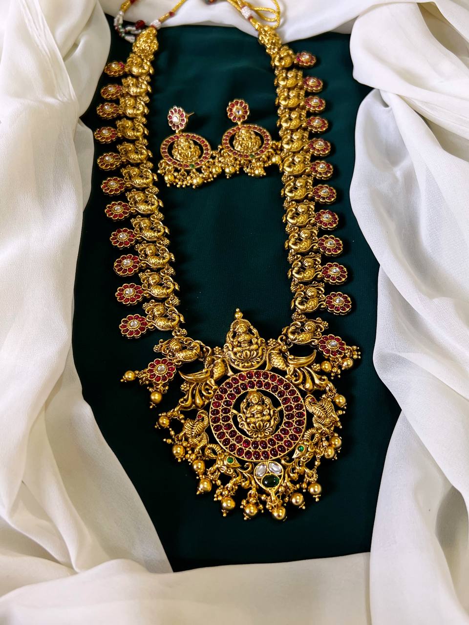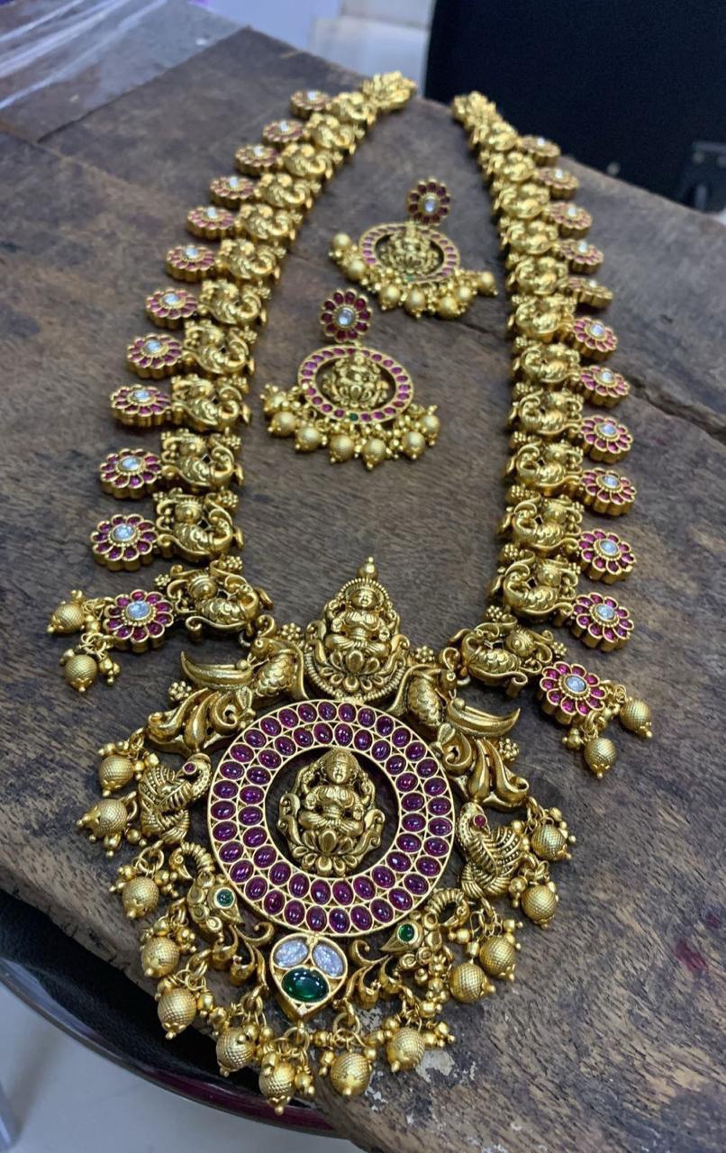 Elevate your accessory collection with this exquisite in Lakshmi with flower Pendent in Naskhi Haram with Earring adorned with earring intricate NAKSHI craftsmanship. This stunning piece combines elegance and tradition, making it a perfect addition to any outfit, whether for a special occasion or everyday wear.