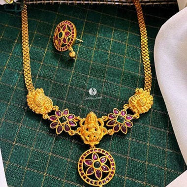 Laxmi Necklace with Earrings Features: Color: Red Style: Round Flower Pendant Material: Brass, jadau Earrings: Yes Experience: Lightweight and comfortable to wear Usage: Great for an everyday celebration