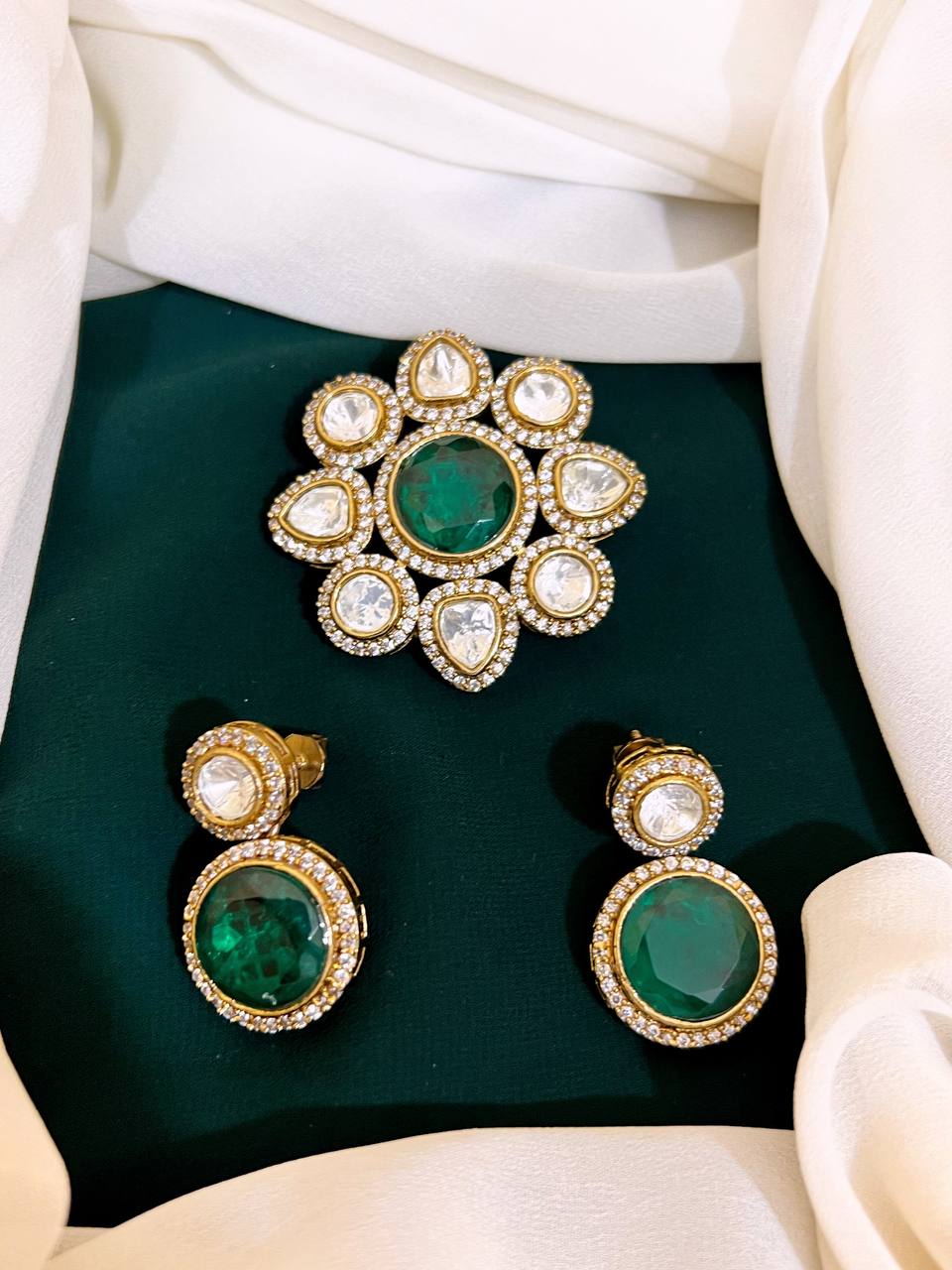This elegant Sea Green Stone Pendant in Kundan is a stunning addition to any jewelry collection. With its intricate design and high-quality Kundan stones, this pendant is sure to enhance any outfit. The vibrant green stone adds a touch of color and charm, making it a perfect choice for any occasion.