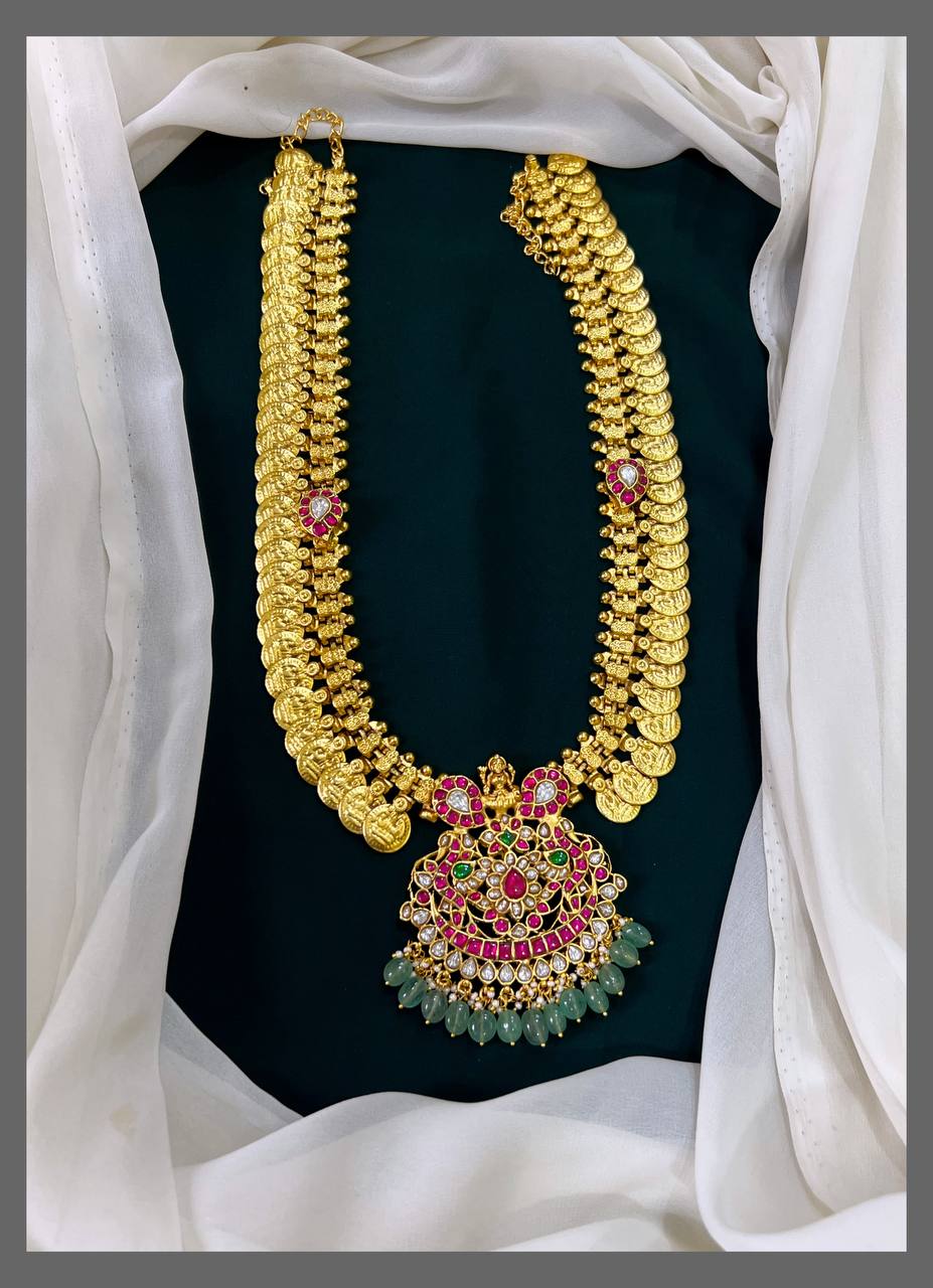 Embrace timeless elegance with our Long Jadau Kasu Haram - KH00205, a magnificent piece that celebrates traditional Indian craftsmanship. This exquisite haram features intricate Jadau work paired with classic Kasu (coin) elements, creating a statement necklace perfect for weddings, festivals, and special occasions. The detailed artistry and substantial length make this haram a treasured addition to your jewelry collection that will be cherished for generations.