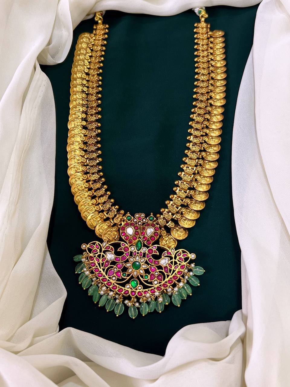 Beautiful long kaasu mala with jadau pendant.