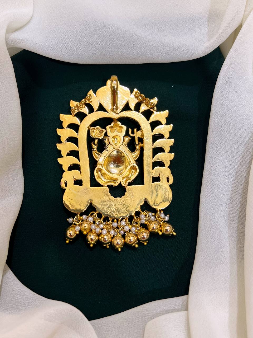Elevate your accessory collection with this exquisite Lord Ganesh in Jadau Kundan adorned with intricate Kundan workmanship. This stunning piece combines elegance and tradition, making it a perfect addition to any outfit, whether for a special occasion or everyday wear.