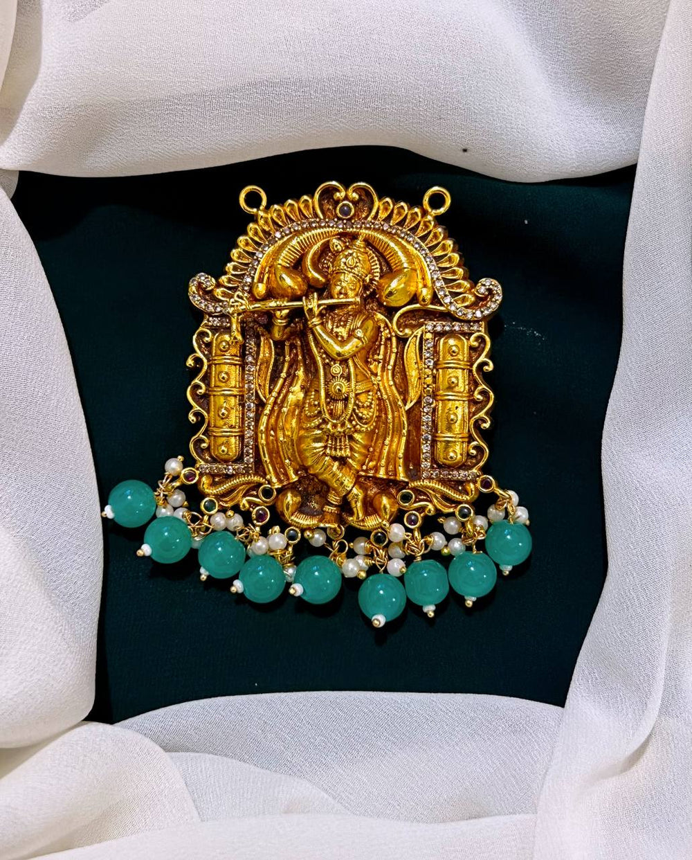 This stunning Lord Krishna pendant in Kundan, KP0065, showcases exquisite craftsmanship and intricate detailing. Made with high-quality materials, this pendant brings a touch of elegance and spirituality to any outfit. Honor the beloved deity and elevate your style with this unique piece.