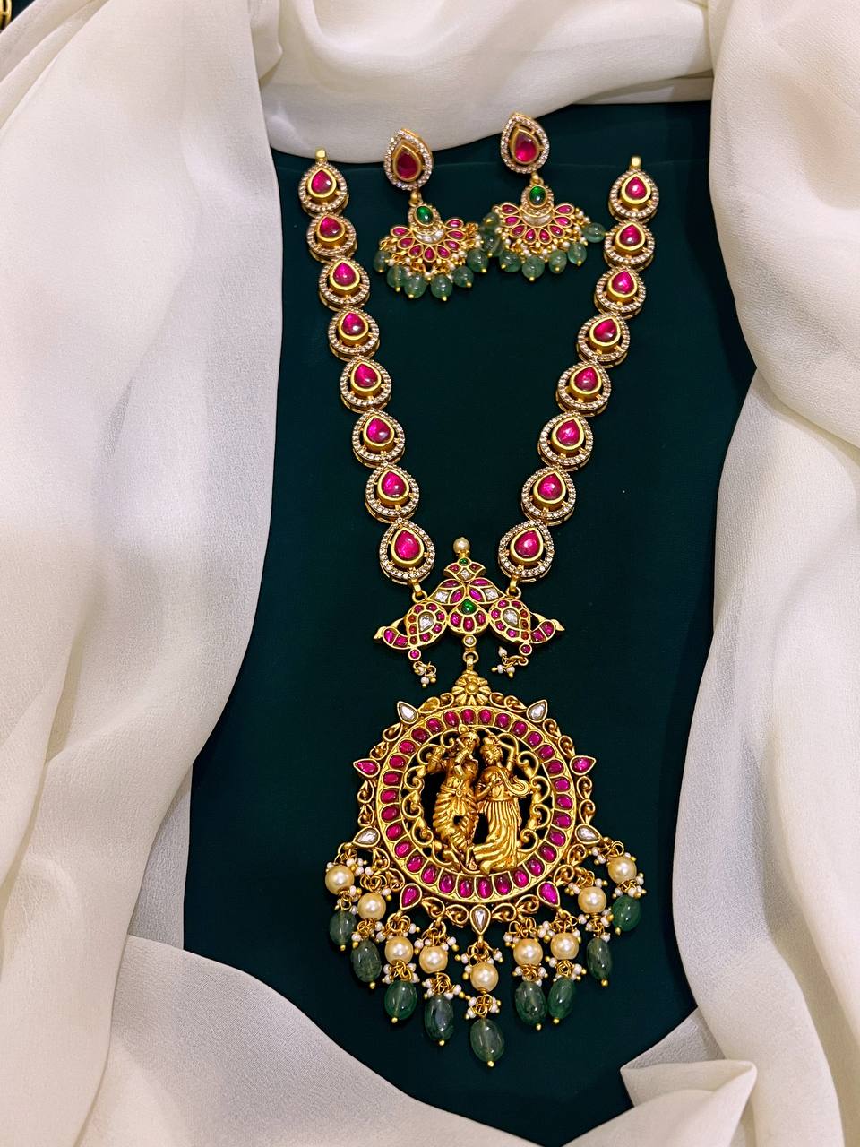 Elevate your accessory collection with this exquisite Lord Krishna with Radhi Jadau Necklace with Earrings adorned with intricate JADAV KUNDAN workmanship. This stunning piece combines elegance and tradition, making it a perfect addition to any outfit, whether for a special occasion or everyday wear.