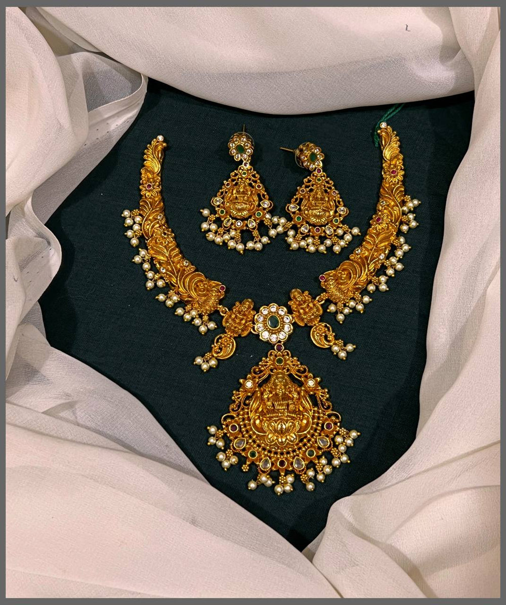 Invite divine blessings into your life with this exquisite Lord Lakshmi pendant, beautifully crafted in traditional Nakshi work. The intricate design features the goddess Lakshmi in the center, complemented by delicate side motifs that enhance its spiritual significance. Each detail is meticulously hand-finished, showcasing the artistry of authentic temple jewelry. Perfect for daily wear or special occasions, this pendant connects you to prosperity and grace. The supportive craftsmanship ensures durability while maintaining the sacred elegance that makes this piece a cherished addition to your collection.