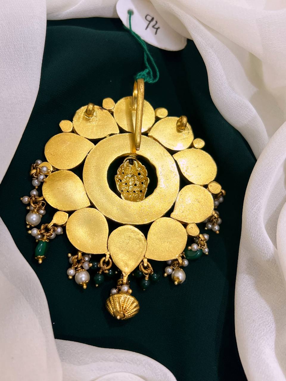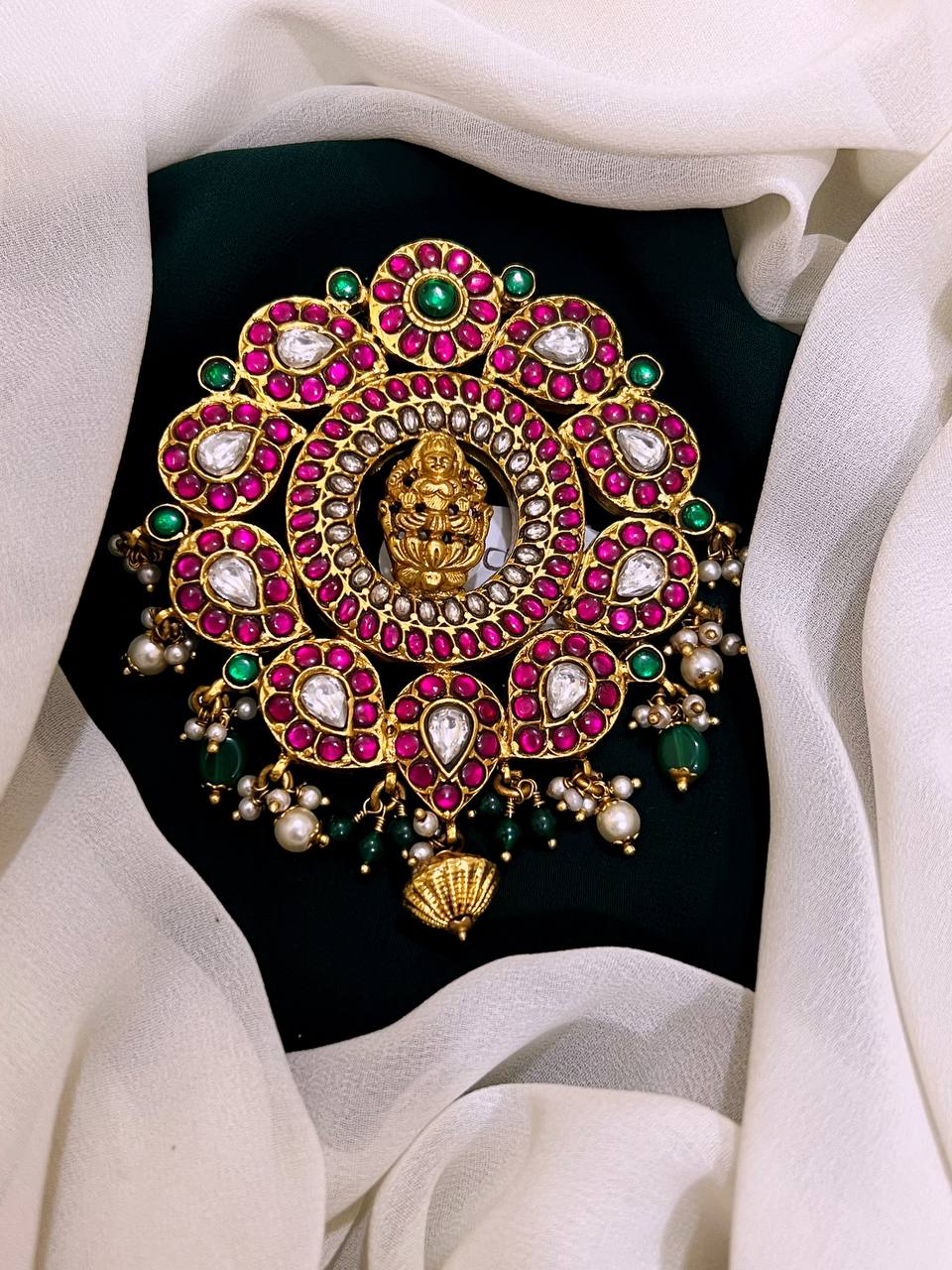 Elevate your accessory collection with this exquisite Lord Lakshmi Pendent in Jadau Kundan adorned with intricate Kundan workmanship. This stunning piece combines elegance and tradition, making it a perfect addition to any outfit, whether for a special occasion or everyday wear.