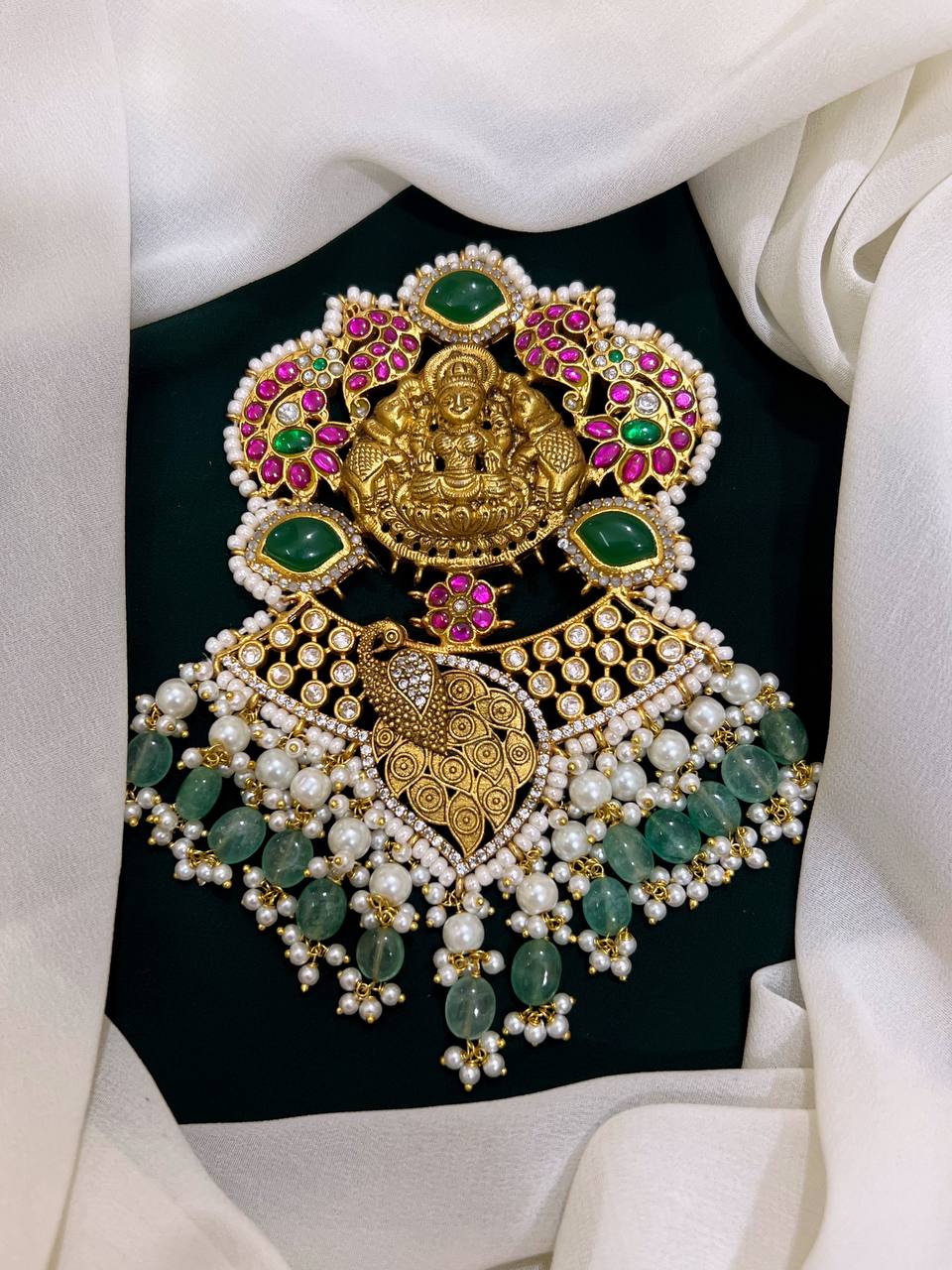 Elevate your accessory collection with this exquisite Lord Lakshmi Pendent with Peacock in Jadau Kundan adorned with intricate Kundan workmanship. This stunning piece combines elegance and tradition, making it a perfect addition to any outfit, whether for a special occasion or everyday wear.