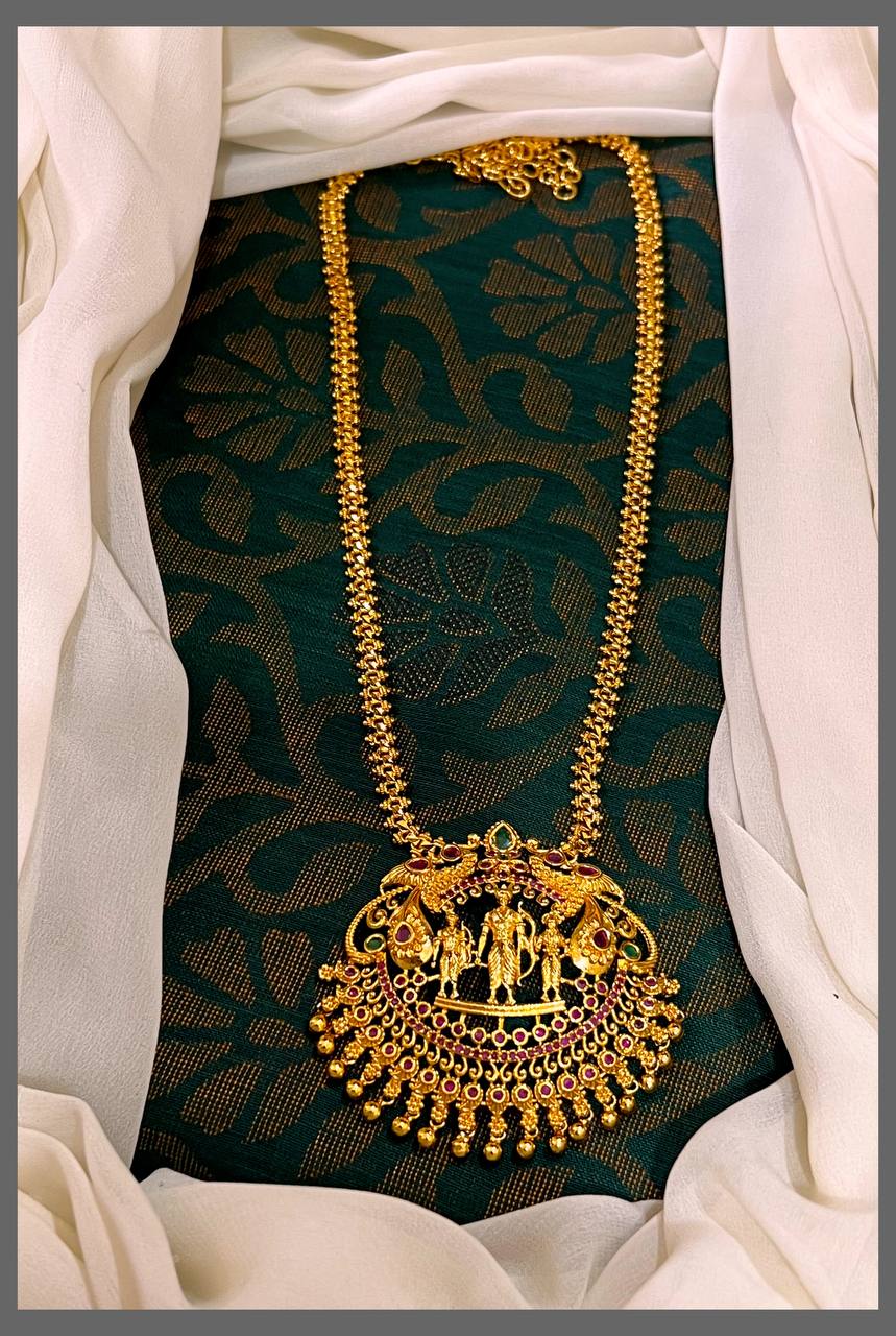 Celebrate devotion with the Lord Ram Parivar Haram in Nakshi design, a beautifully crafted necklace that honors the divine family. This elegant piece combines traditional artistry with spiritual symbolism, making it a meaningful addition to your jewelry collection. Perfect for daily wear or special occasions, it supports your faith while enhancing your style with intricate detailing and a comfortable fit. Embrace the grace and blessings of Lord Ram Parivar wherever you go.