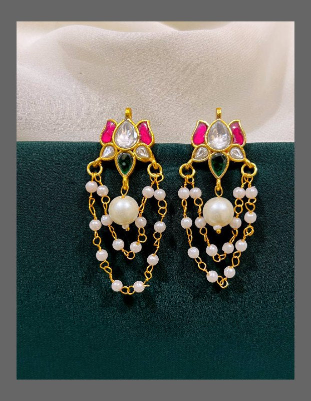 Elevate your elegance with the Lotus Pearl Hanging Earrings in Kundan. These beautifully crafted earrings feature delicate lotus motifs adorned with lustrous pearls, offering a timeless charm. Perfect for special occasions or adding a graceful touch to everyday wear, they blend traditional artistry with modern style to complement any outfit effortlessly.