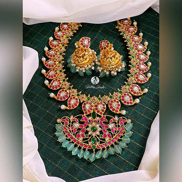 Mango Haram Kundan with Earrings Features: Color: Ruby, Sky Blue Style: Flower Pendant, Mango Material: Brass, Jadau Earrings: Yes Experience: Lightweight and comfortable to wear Usage: Festive and traditional Events