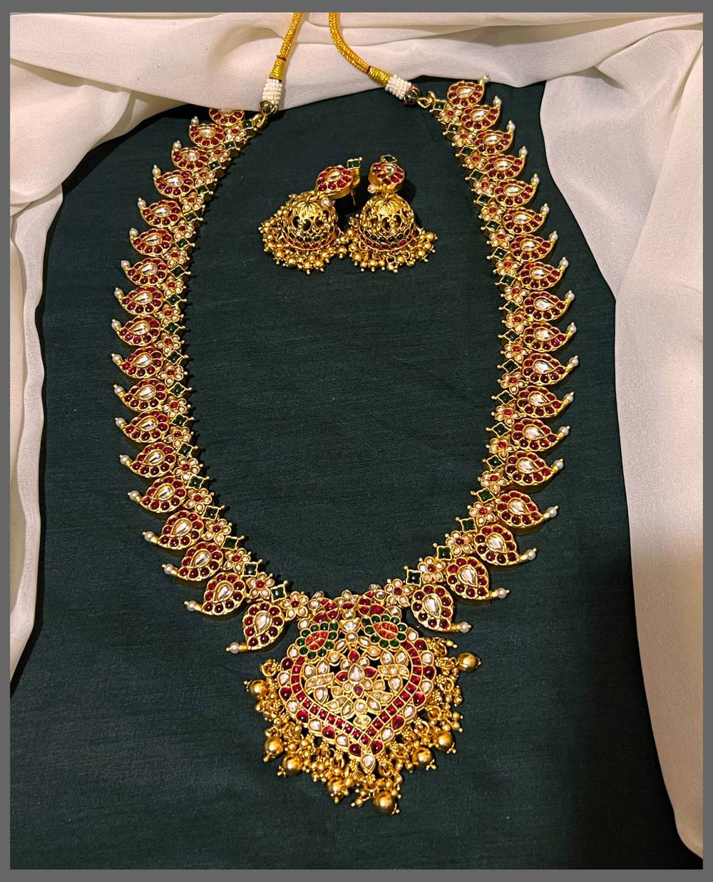 Elevate your traditional collection with this exquisite Mango Haram, a timeless piece that celebrates classic Indian jewelry craftsmanship. The design features an intricately detailed pendant adorned with authentic Nakshi work, showcasing delicate hand-carved patterns that catch light beautifully. This versatile haram complements both everyday wear and special occasions, making it a cherished addition to your jewelry box. The traditional mango motif symbolizes prosperity and grace, while the fine craftsmanship ensures lasting quality. Perfect for those who appreciate the artistry and heritage of authentic Indian jewelry design.