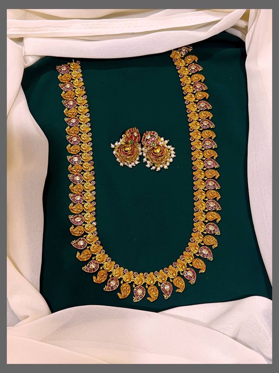 This exquisite Mango Haram with Jhumki in Nakshi design blends traditional artistry with elegant charm. Crafted to highlight intricate patterns, it offers a rich cultural touch to your ensemble. Perfect for special occasions, this piece enhances your look with timeless grace while providing comfortable wear throughout the day. Add a classic statement to your jewelry collection with this beautifully designed set.