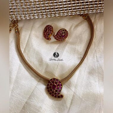 Mango Necklace with Earrings Features: Color: Red Style: Mango Pendant Material: Brass Earrings: Yes Experience: Lightweight and comfortable to wear Usage: Great for an everyday celebration